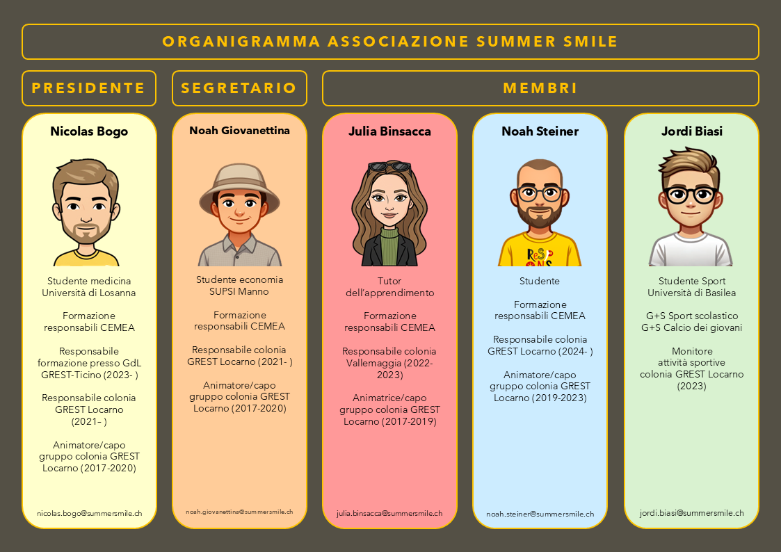 SUMMERSMILE è un'associazione apartitica e aconfessionale nata nel novembre 2023 su iniziativa di 5 giovani che sentivano la necessità di promuovere attività per i ragazzi e le ragazze del Canton Ticino